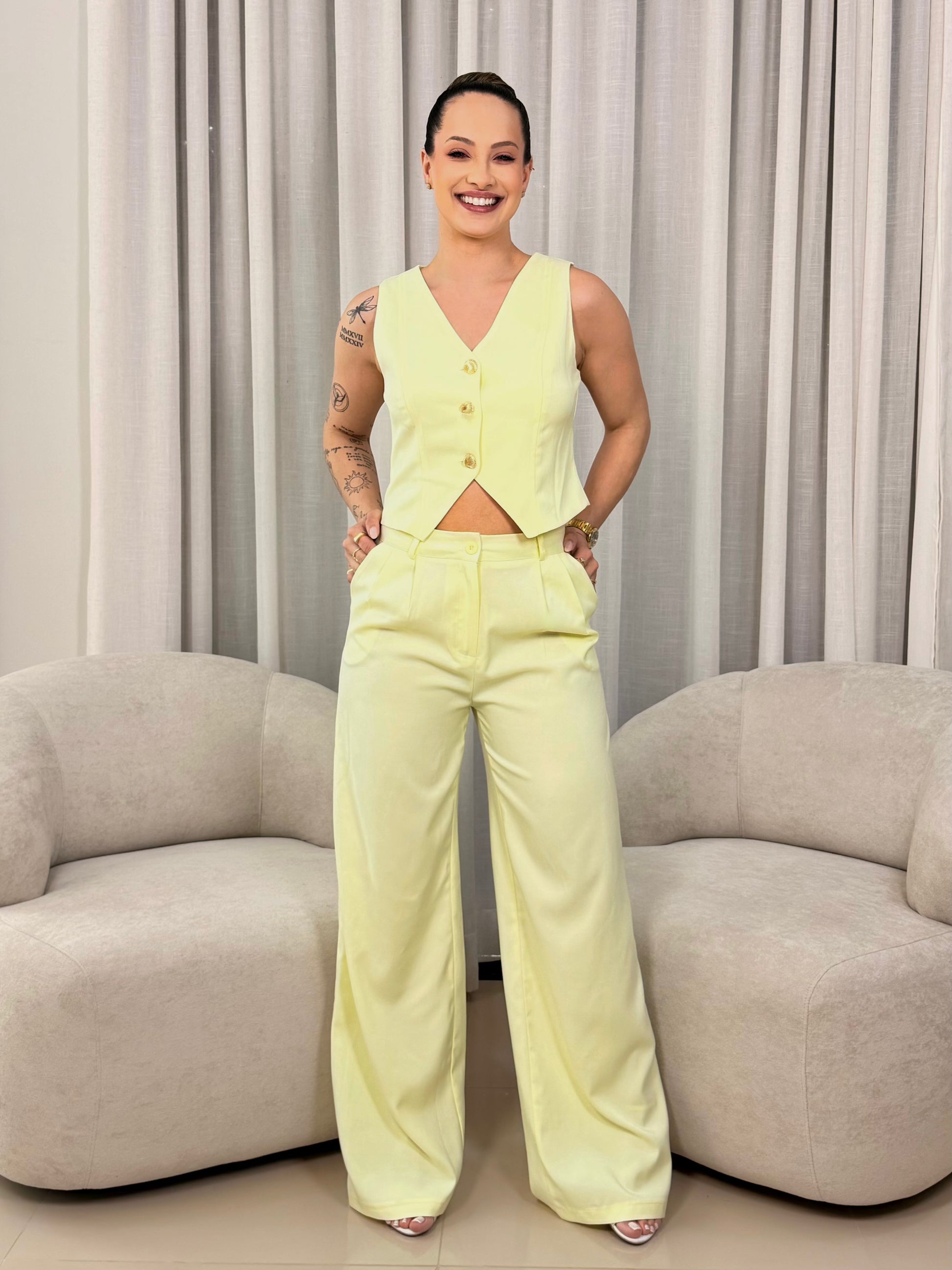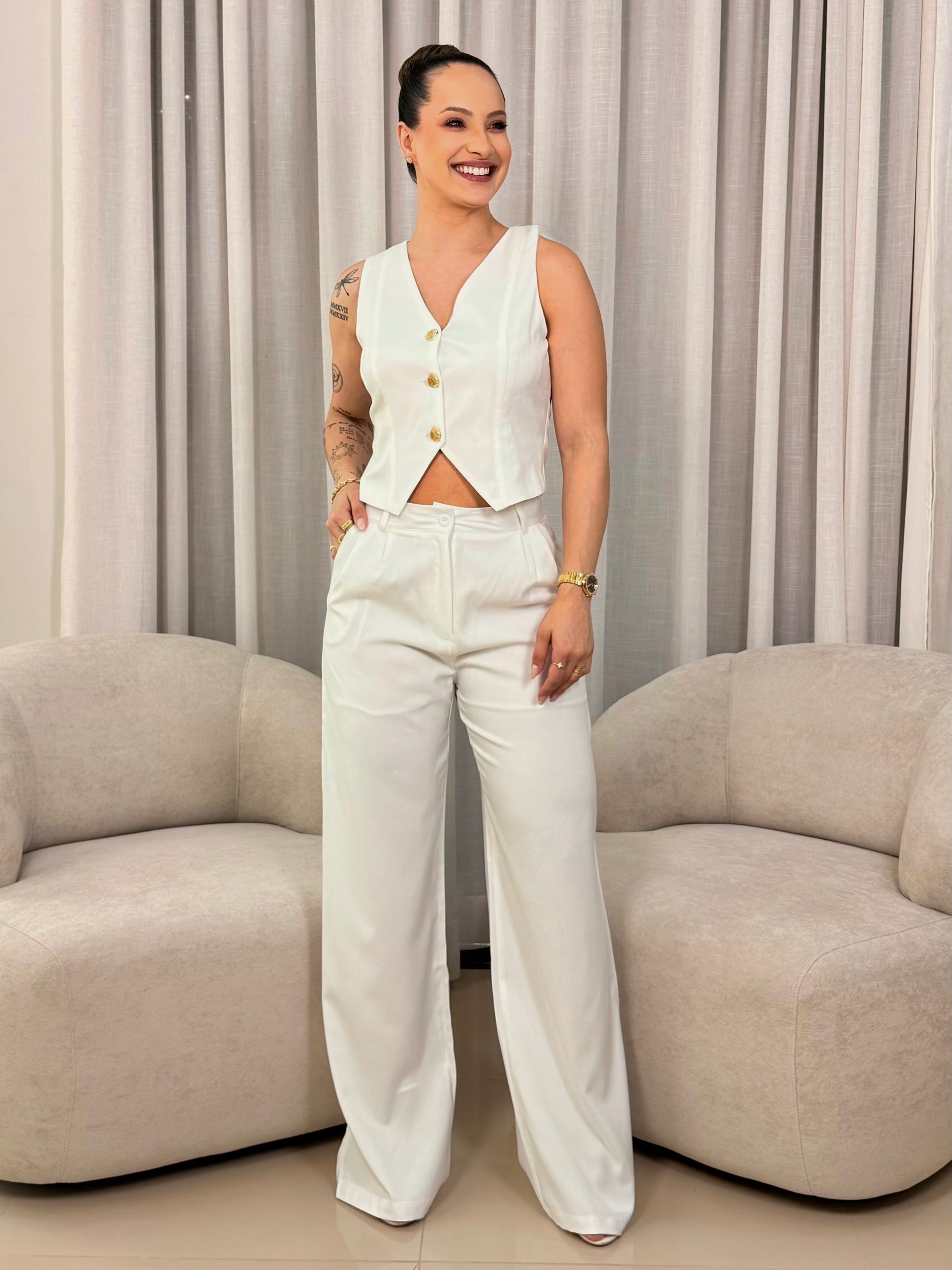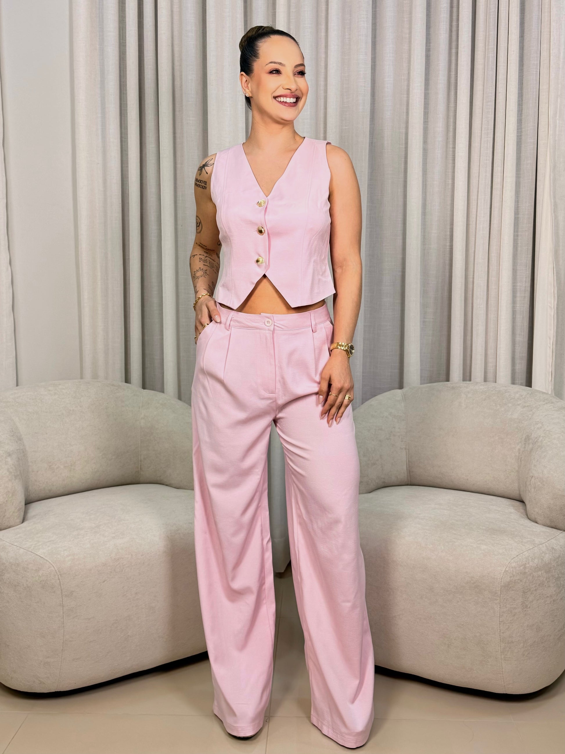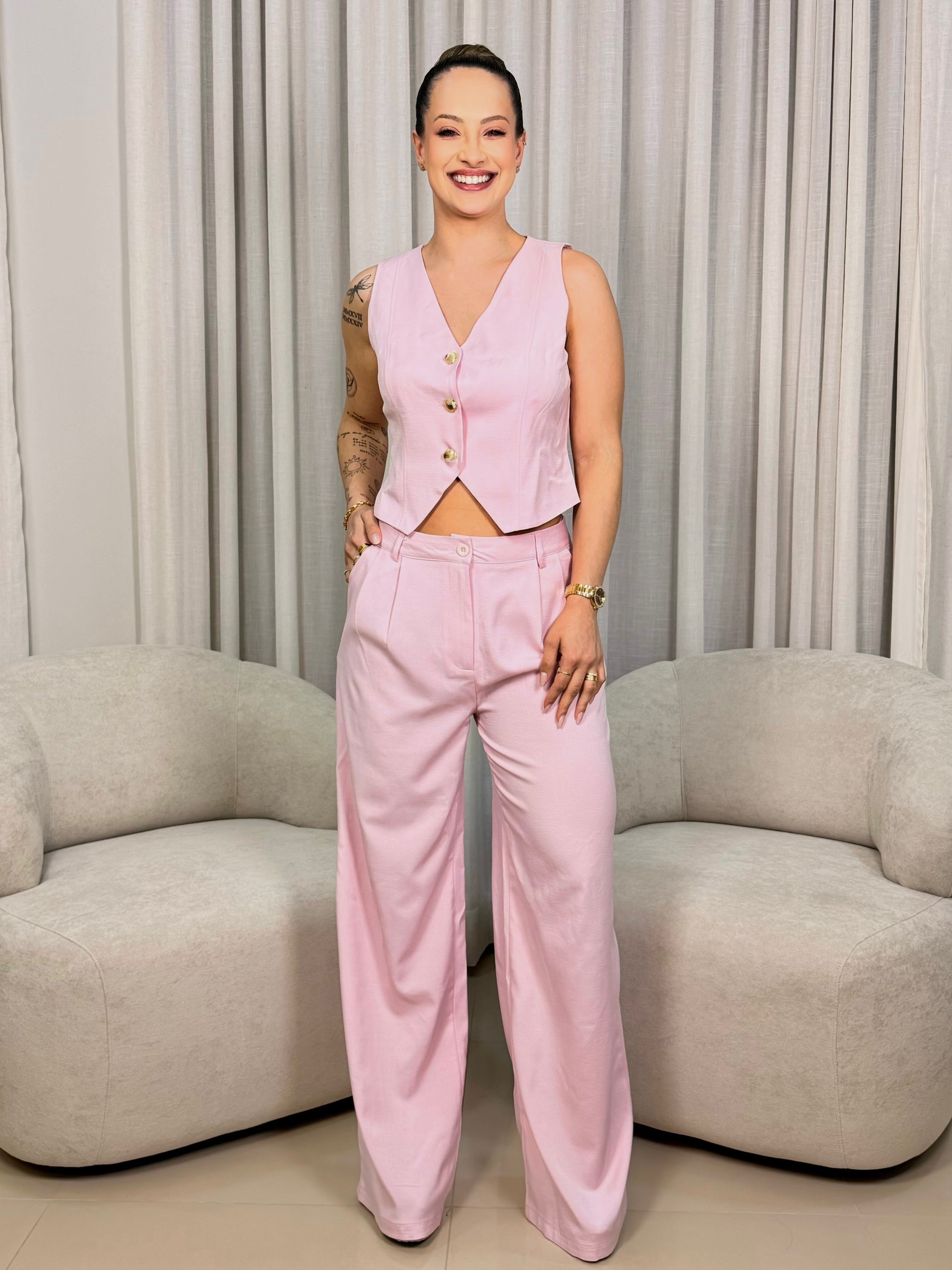 A calça de alfaiataria possui modelagem leve e moderna, garantindo conforto, movimento suave e aquela estética chique que nunca sai de moda.
